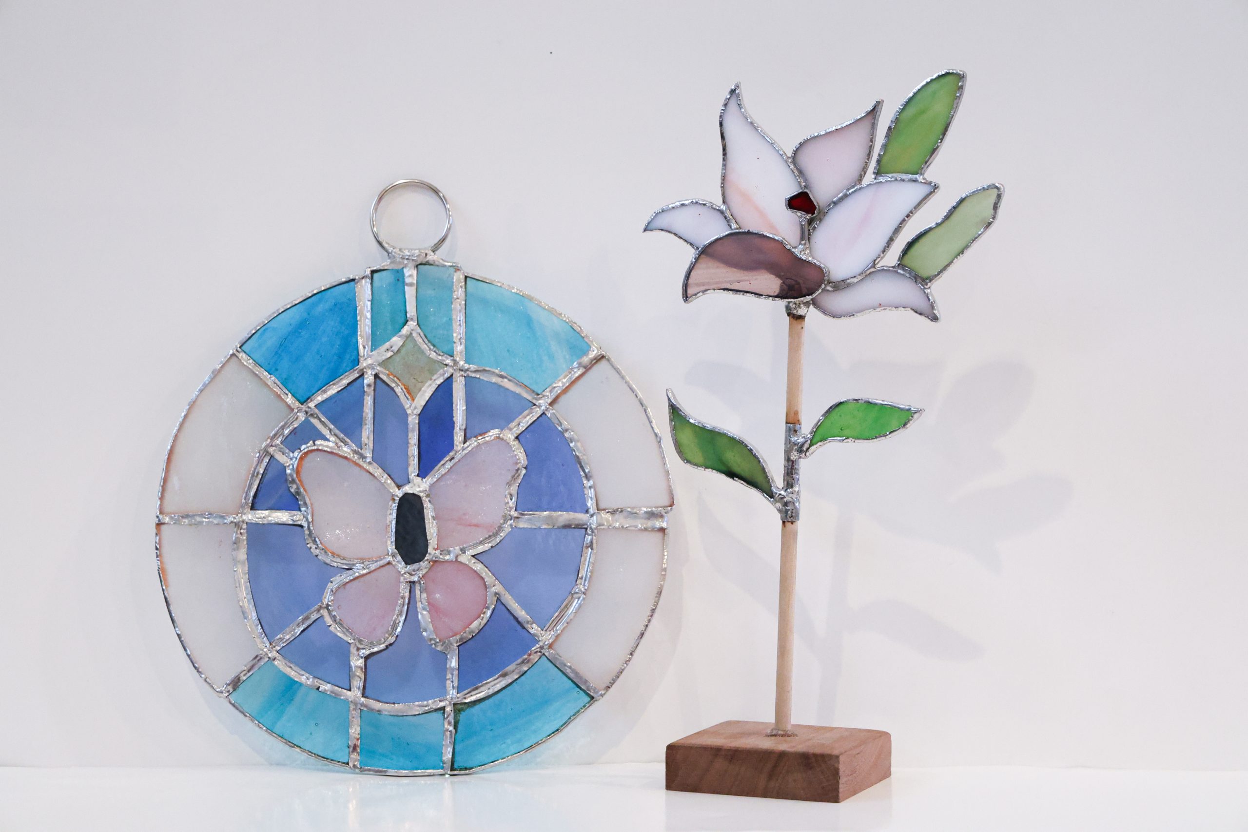 These are two projects that I created while working with stained glass at my high school. The first project is a stained glass window of a butterfly. I then made the stained glass flower as an extra project for my mother which was difficult because of its many layers soldered on top of each other.